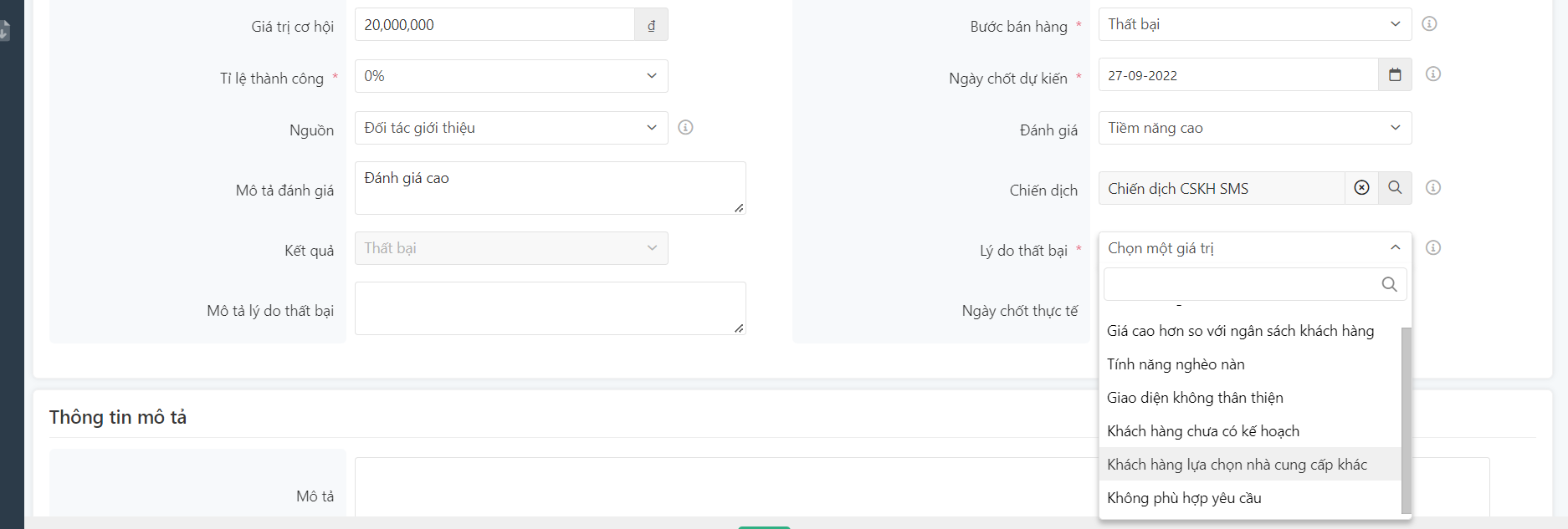 Đối với trường hợp cơ hội chốt thất bại, bạn cần chọn thêm lý do thất bại. Điều này vô cùng quan trọng để bản thân bạn hoặc cấp quản lý có thể thống kê được số lượng cơ hội thất bại + lý do thất bại từ đó có thể điều chỉnh lại các hoạt động chăm sóc, điều chỉnh lại chính sách bán hàng …