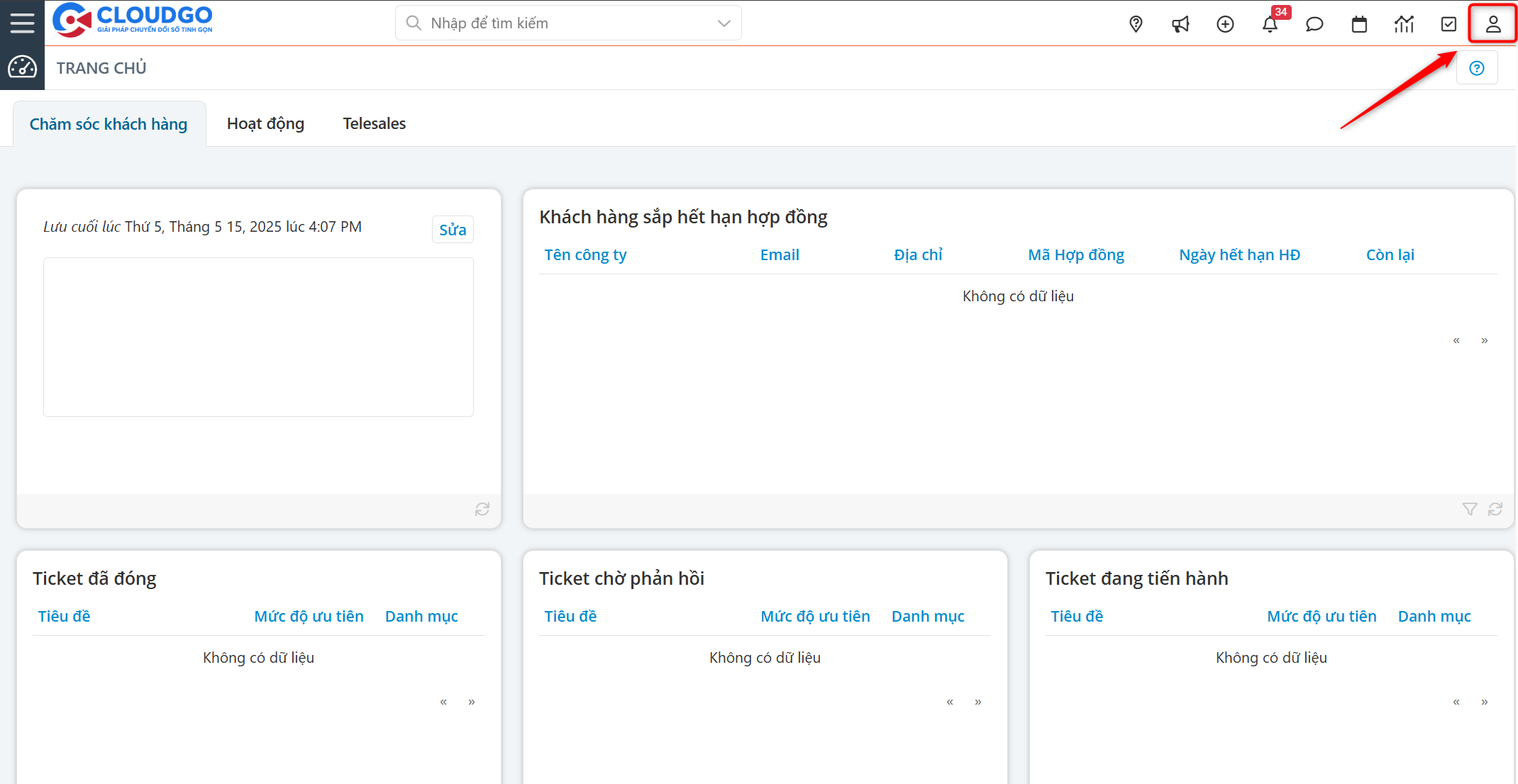 Tại thanh công cụ, bạn có thể click vào đây để truy cập vào màn hình quản lý Chatbox Zalo (hay còn gọi là hộp chat zalo tập trung trên CRM).