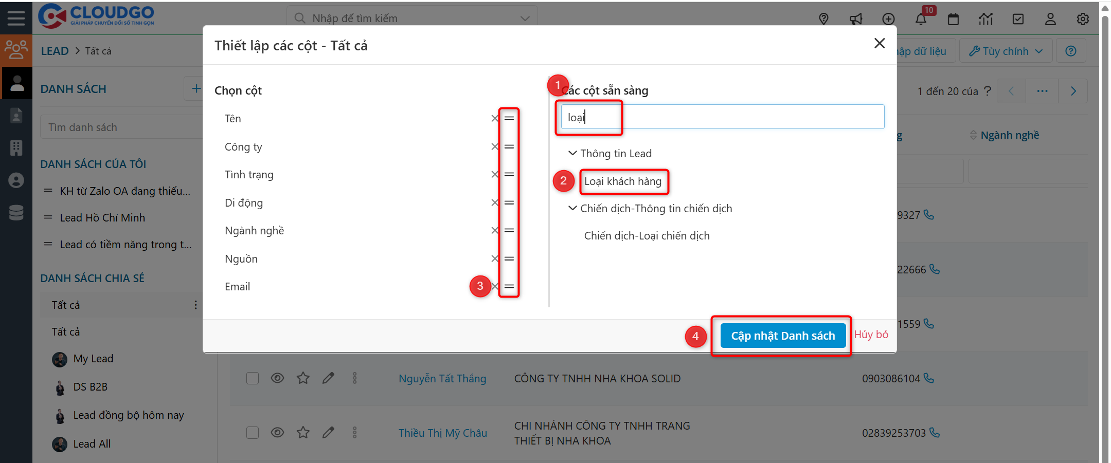 Ví dụ: Sau khi có kết quả tìm kiếm cho bộ lọc, bạn muốn ở màn hình danh sách của bộ lọc chỉ hiển thị các cột quan trọng như: Họ và tên, số điện thoại, emai, công ty, địa chỉ, người phụ trách. Để thực hiện bạn làm theo hướng dẫn sau đây:
