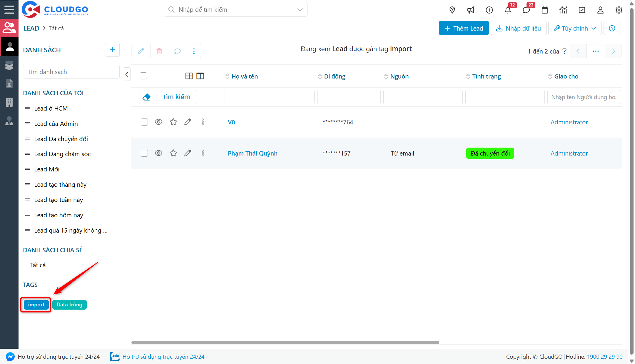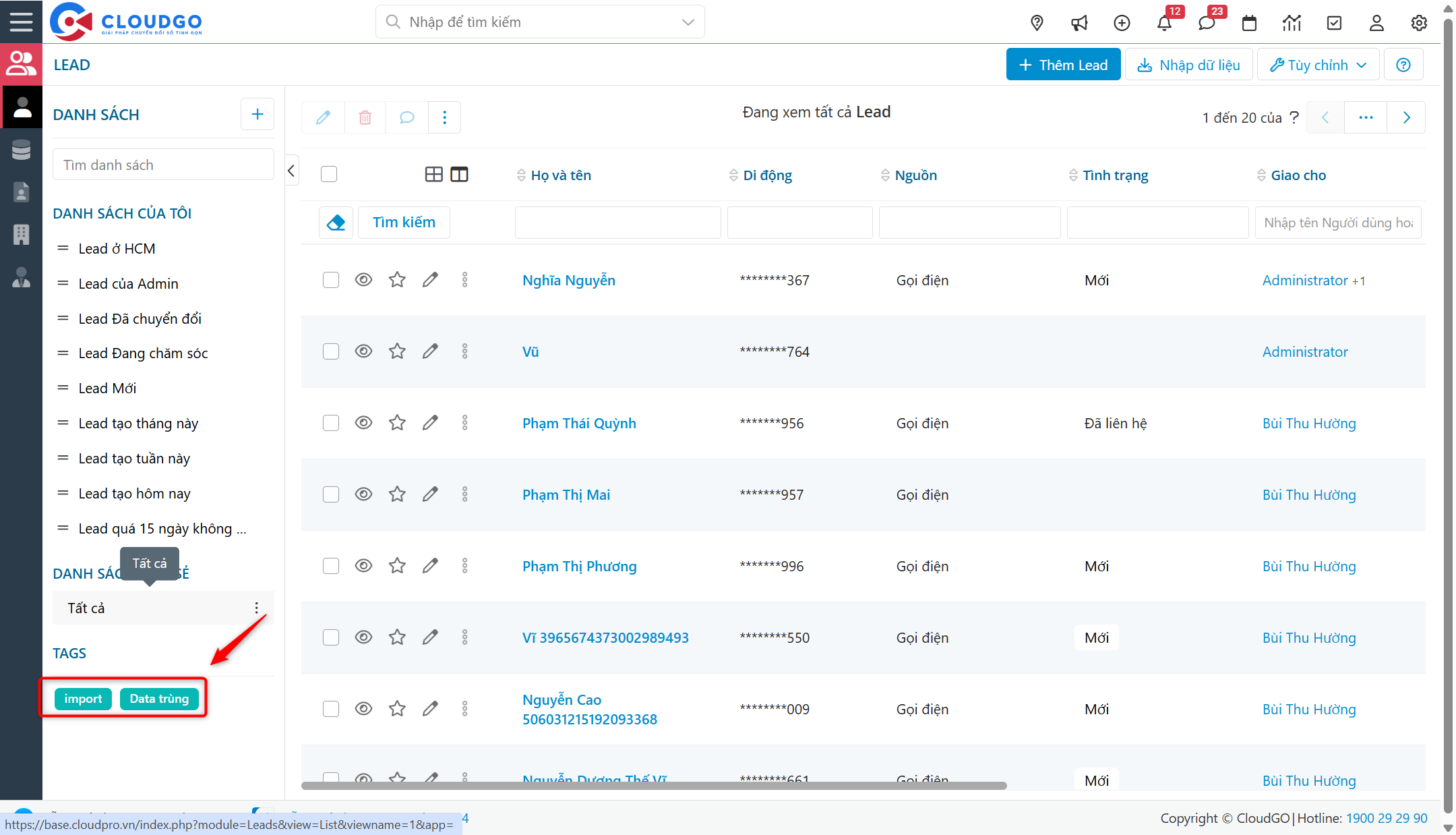 Chức năng gắn Tag giúp bạn có thể lưu danh sách Lead (có chung đặc điểm) của bạn vào chung 1 Tag và xem danh sách Lead theo Tag đã gắn.